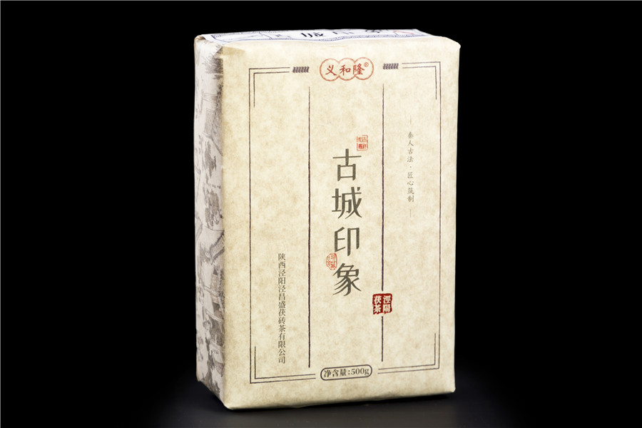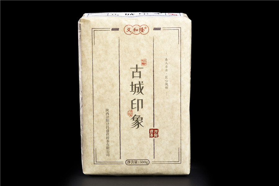 涇昌盛茯茶.古城印象:本品選用三地原料科學拼配制作、金花繁茂湯色橙紅橙黃,滋味甘醇濃厚,外觀古樸。
